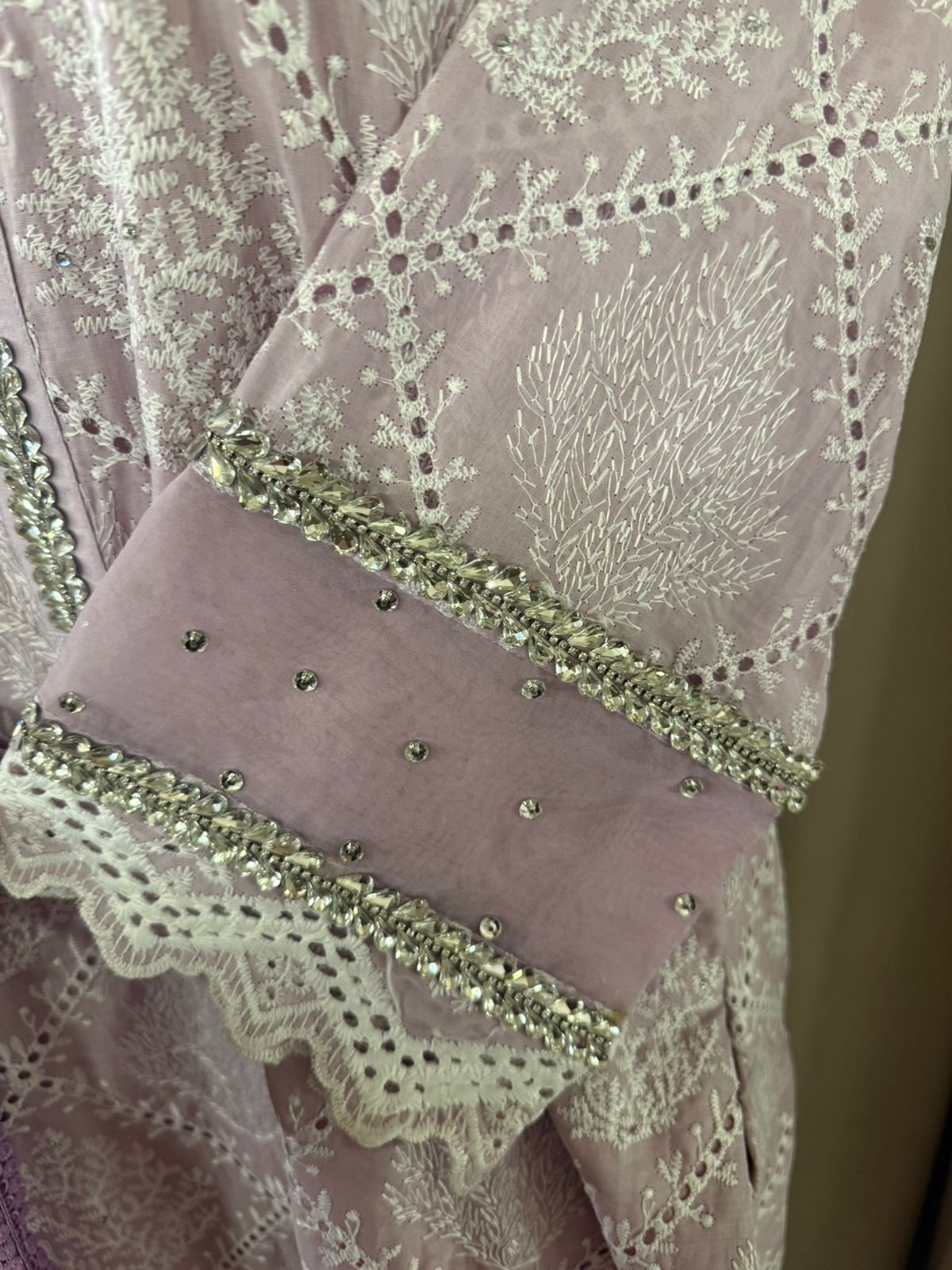 Small elegant lace on the dupatta edges and light stone work all over the kameez.