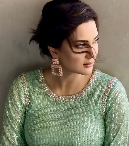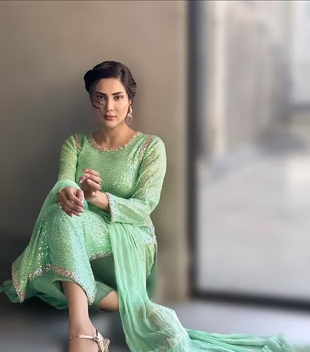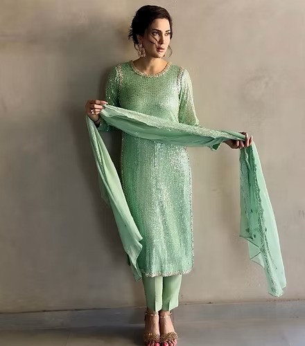 This elegant ensemble features a kameez crafted from a luxurious, stone-embellished fabric that radiates subtle shimmer. The neckline, sleeve edges, and hemline are intricately adorned with delicate stonework, adding a refined sparkle to the overall look. It is paired with straight pants and crinkle chiffon dupatta, beautifully embroidered.