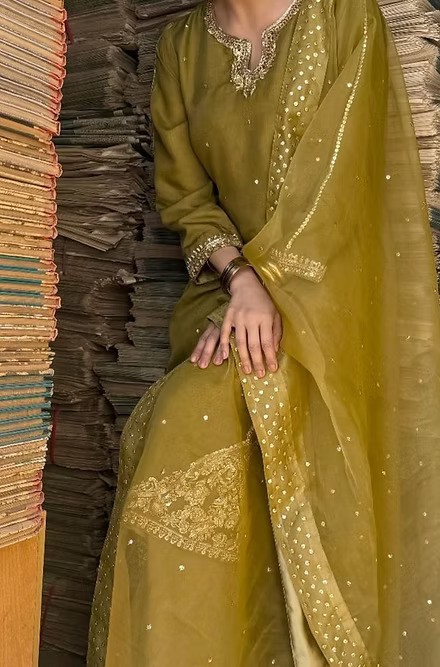 This elegant ensemble features a luxurious silk kameez, richly adorned with intricate handwork along the neckline, sleeve borders, and the edges of the kameez itself. Delicate chahta work embellished with sitara all over the kameez. The outfit is paired with a light weight organza dupatta and it’s featured with intricate sitara work along its border. The rest of the fabric is adorned with a delicate chahta pattern spread evenly across the entire dupatta.