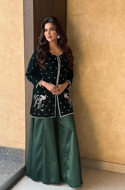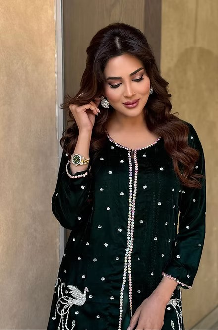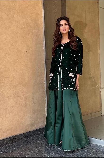 A stunning ensemble featuring a beautifully velvet shirt, paired with a sharara. Intricate handwork adorns every inch of the kameez and chahta, with delicate stones. The borders of the kameez, neckline, and sleeves are lavishly embellished with sparkling stones.